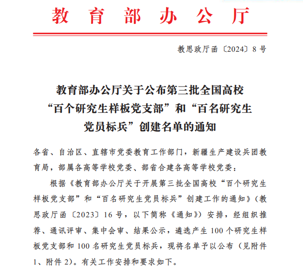 4月17日,教育部公布了第三批全国高校“百个研究生样板党支部”和“百名研究生党员标兵”创建名单。经组织推荐、通讯评审、集中会审、结果公示,遴选产生 100 个研究生样板党支部和 100 名研究生党员标兵。