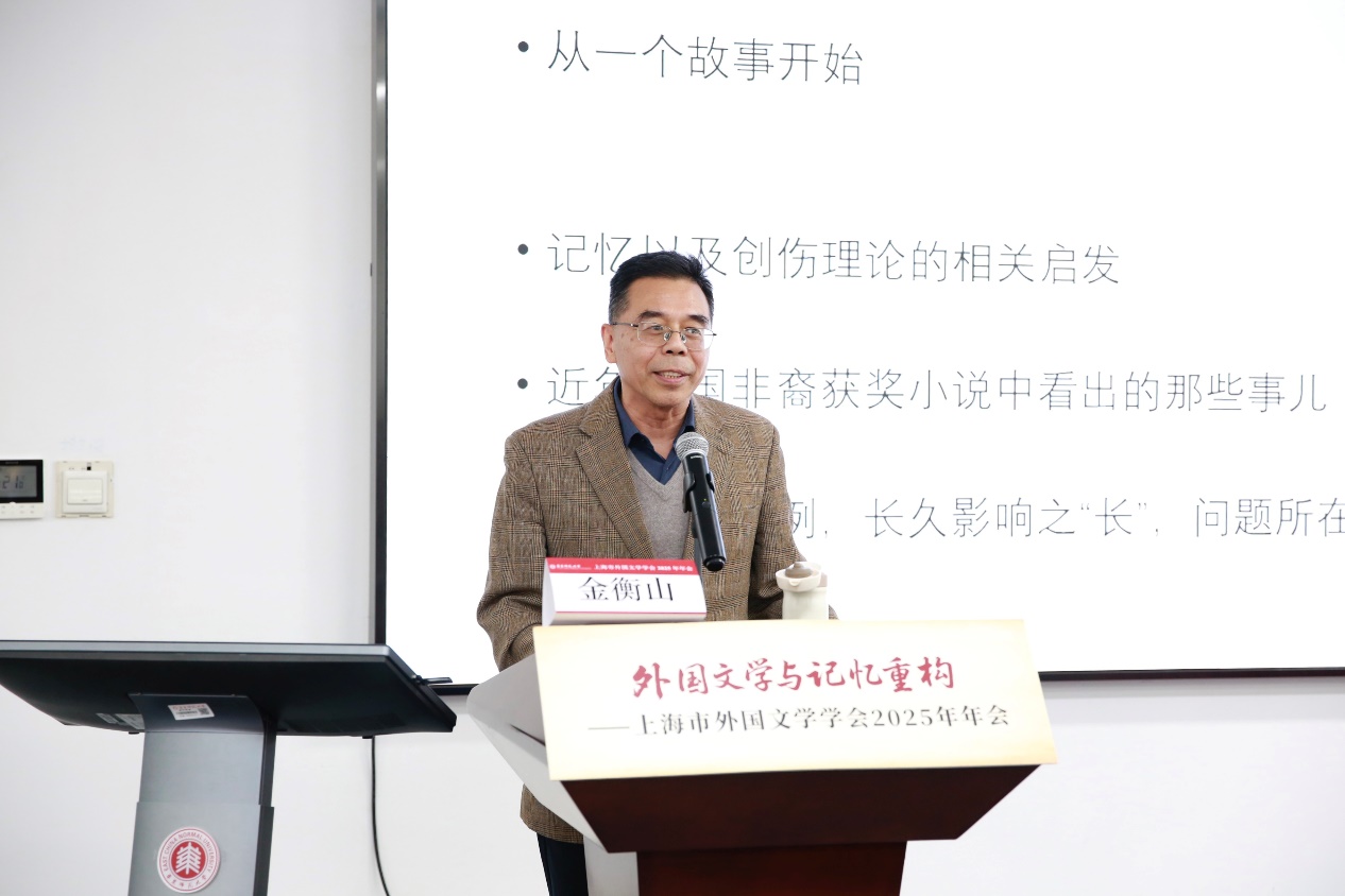 副会长、华东师范大学金衡山教授以《黑奴记忆与创伤的长久影响:文学创作与公共话语的反映/应》为题,从文化记忆理论出发,分析非裔获奖小说的记忆表征,探讨文学文本与社会历史事件的相互映照。金衡山教授认为,非裔美国文学正是通过想象的再现过程,将种族创伤转化为具有社会意义的叙事实践,并在这一过程中构建道德立场与身份认同,但其中也存在为对应主题而压缩历史复杂性等现象。他以一个开放性问题:“记忆能否被超越?”作结,指出真正的进步需基于“种族是人类共同人性的一部分”的社会共识。