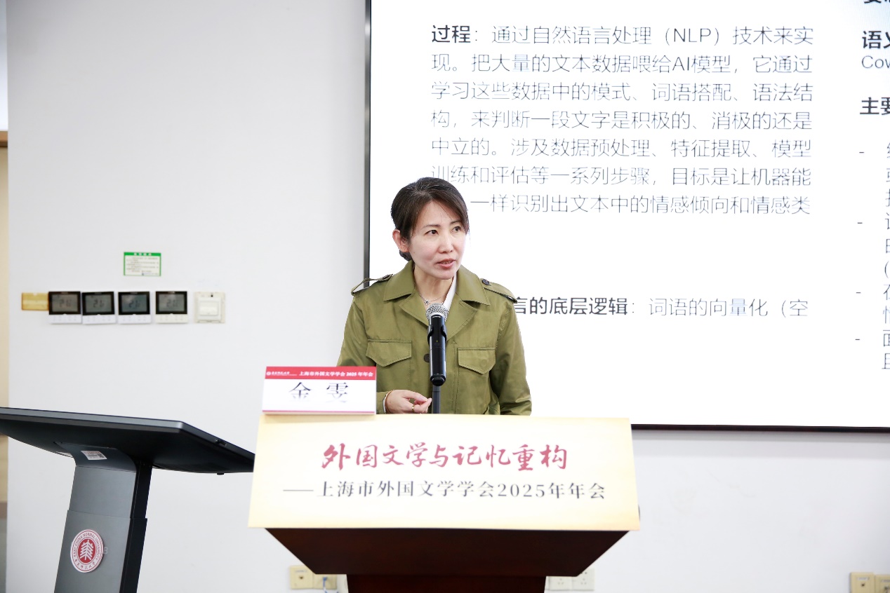 第三阶段的主旨报告由副会长、同济大学刘晓芳教授,上海外国语大学李尚宏教授,上海财经大学谭琼琳教授主持。华东师范大学金雯教授在她的发言中讨论了当代人工智能语境中的记忆与情感关系。她指出,文化记忆的形塑与情感治理紧密交叉,记忆理论必须与情感理论发生深度对话才能增强自身解释文化现象和参与社会构建的功能。金雯教授展示了计算机、量子物理、人工智能等前沿领域对身体和情感规律的探索,认为在稳定性基础上拥抱不确定性,是深度情感认知的起源,也是创造力的条件。