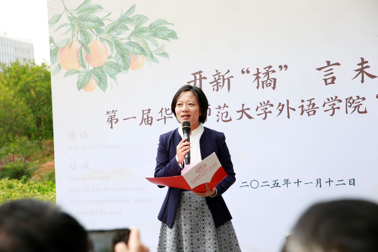 一年好景君须记,共赴外语“橘言”时。2025年11月12日,ob体育-ob体育试玩-ob体育官网 第一届“橘言”文化节在外语楼樱桃河畔正式启动。伴随着清雅橘香,师生校友一同采秋实、赏秋色,话育人、谋未来,以文陶铸人心,坚定育人使命。校党委副书记、纪委书记曹友谊,纽约大学兼职教授、联合国语言部中文组前组长何勇,ob体育 法语系退休教授、橘园发起人何敬业,黄岩上海商会名誉会长、上海伊士通新材料发展有限公司总经理袁利敏,黄岩上海商会会长、上海元邦集团有限公司总经理吴文华,上海电器科学研究所(集团)有限公司副总裁、华师大校友陈红洁,校职能机关、兄弟院系领导及ob体育 师生、校友代表出席活动。