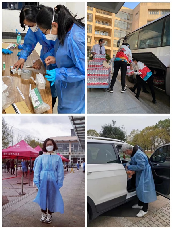 英语系翻译系联合教工党支部党员杨延宁、法德俄联合教工党支部党员朱伟明、尤岚岚,大学英语教学部教工党支部党员桑紫林、关小仙、郭雯婷、汪燕,行政党支部党员高冬琴,学术型研究生第二党支部党员胡真、张凤吉,学术型研究生第三党支部党员罗梦玲、汤杰,专业型研究生第二党支部彭月等师生主动参加社区志愿服务,协助物资配送发放,核酸检测秩序维护、小区消杀等工作。