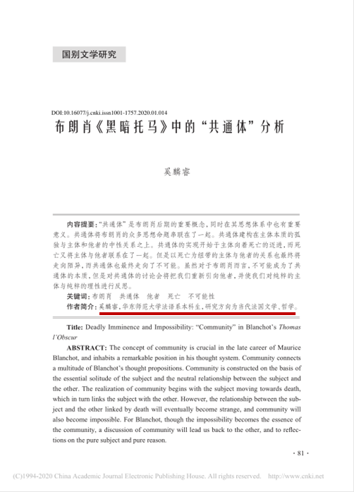 在这篇论文中,奚麟睿从具体作品入手阐发布朗肖“共通体”理论的特殊性。布朗肖的“共通体”理论上承让-吕克·南希(Jean-Luc Nancy),但是却发展出了许多建设性的概念。所谓的“共通体”,在法文里是communauté一词(英文community),一般翻译为“共同体”。但是布朗肖的“共通体”理论与普通的“共同体”有所不同,一般意义上的“共同体”强调“同一性”,而“共通体”则强调其团体中每一个体相互的理解、相互的通感。
