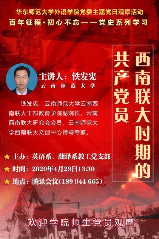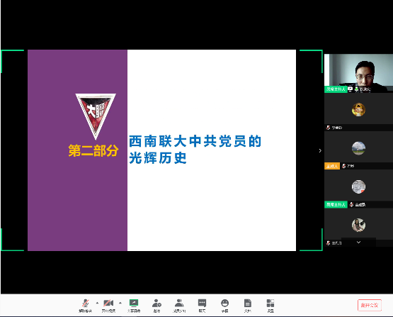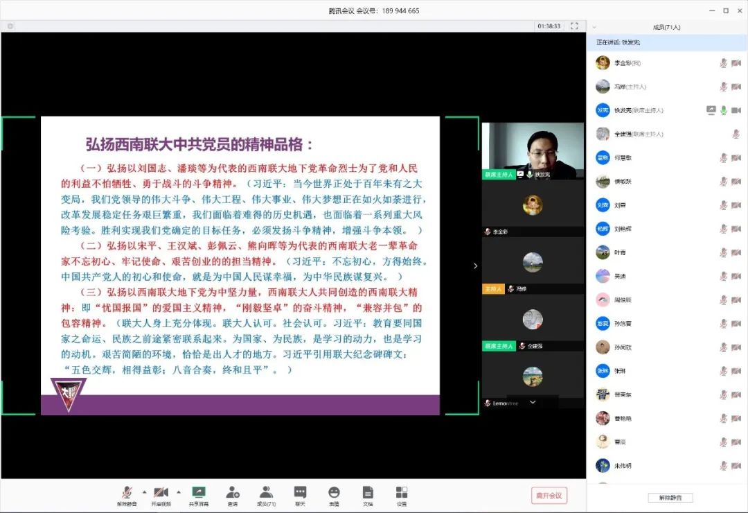 这次主题党日活动中,安排了ob体育 党委 “百年征程·初心不忘——党史系列学习”的第一讲,特邀了云南师范大学西南联大干部教育ob体育 副院长、云南西南联大研究会会员、云南师范大学西南联大文创中心特聘专家铁发宪老师,以“西南联大时期的共产党员”为题,在线上带领大家重温了西南联大的辉煌历史,对西南联大时期的共产党员的英勇事迹和崇高的革命奋斗精神进行了系统深入的学习。