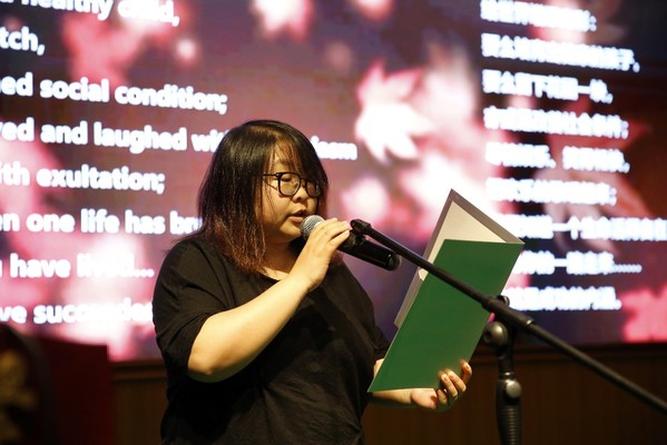 英语翻译联合教工党支部陈贝贝朗诵的英文诗《成功的内涵》,阐释了人生的意义在于人格更加完整、人性更加丰满,真正的成功是有爱、有奉献。