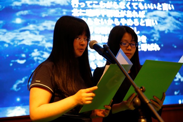 结合“青春·爱国·奋斗”主题活动,本次党员大会现场也进行了主题活动成果展示。来自日语西语联合教工党支部王建英、陈凌虹、杨敬、金晶用日语演绎了诗歌《不畏风雨》,号召大家莫怕困难,砥砺奋进。