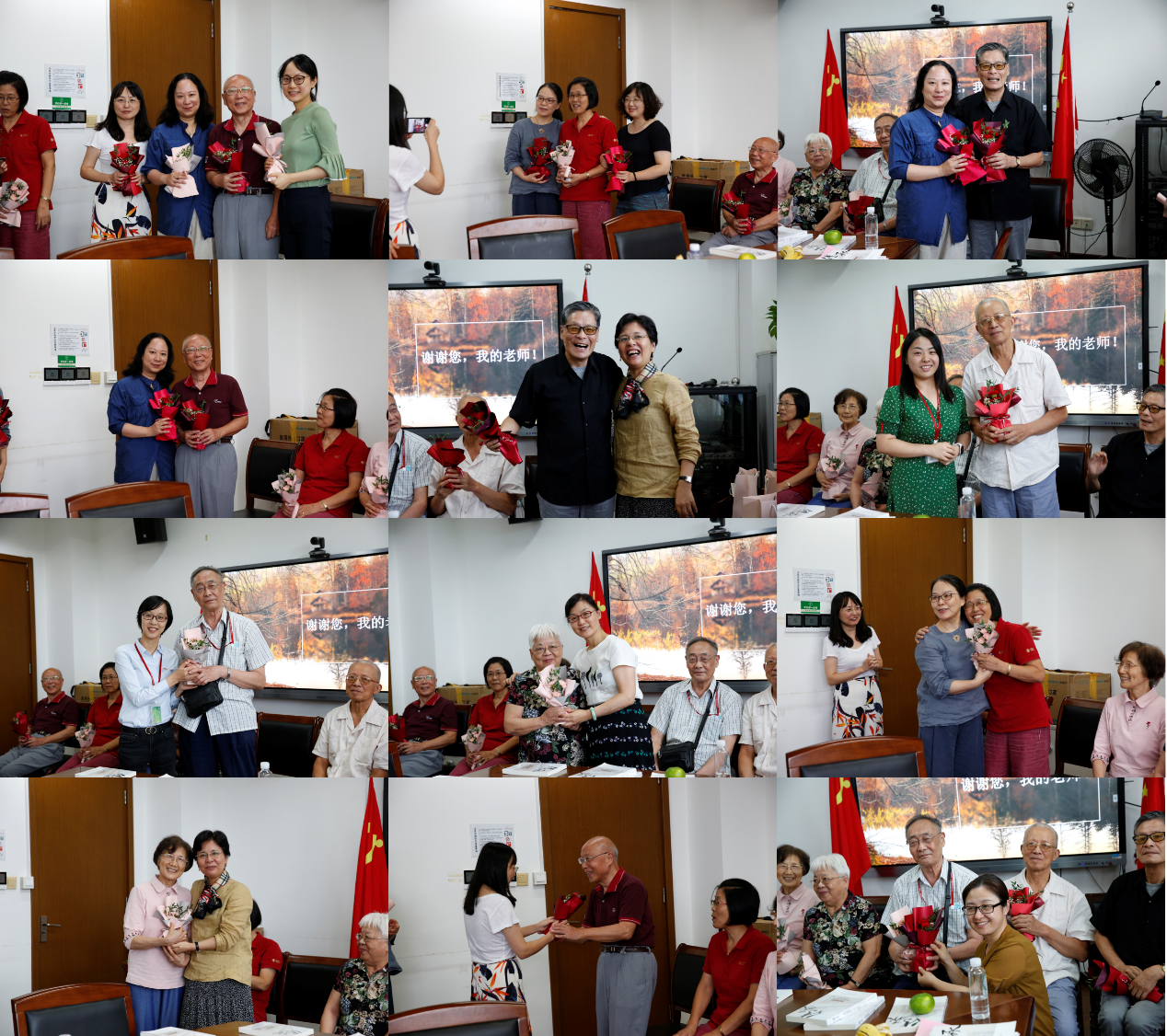 在“我和我的老师”交流环节,教师代表与老教师在温馨欢快的氛围中共同回忆了师大学习和工作的时光,青年教师代表为敬爱的老教师们送上美丽的鲜花。一张张老照片承载着一段段动人的记忆,一束束鲜花诉说着一份份饱含深情的敬意。