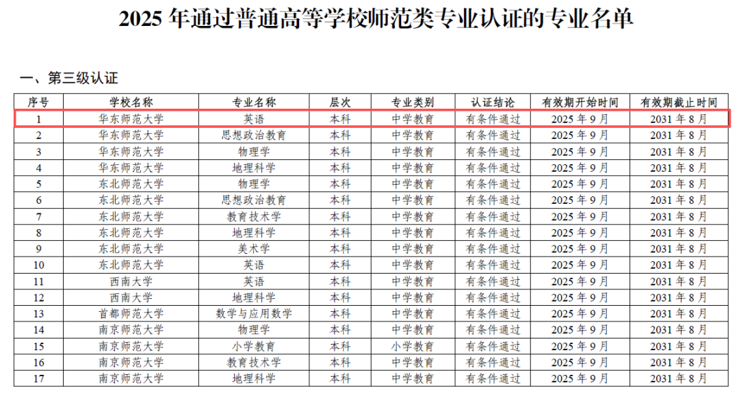 根据《中共中央国务院关于弘扬教育家精神加强新时代高素质专业化教师队伍建设的意见》精神,按照《教育部关于印发〈普通高等学校师范类专业认证实施办法(暂行)的通知》(教师〔2017〕13号)要求,经高校申请、教育评估机构组织专家考查、普通高等学校师范类专业认证专家委员会审定,华东师范大学英语专业等17个专业通过第三级专业认证,认证结论有效期六年,自2025年9月起至2031年8月止。